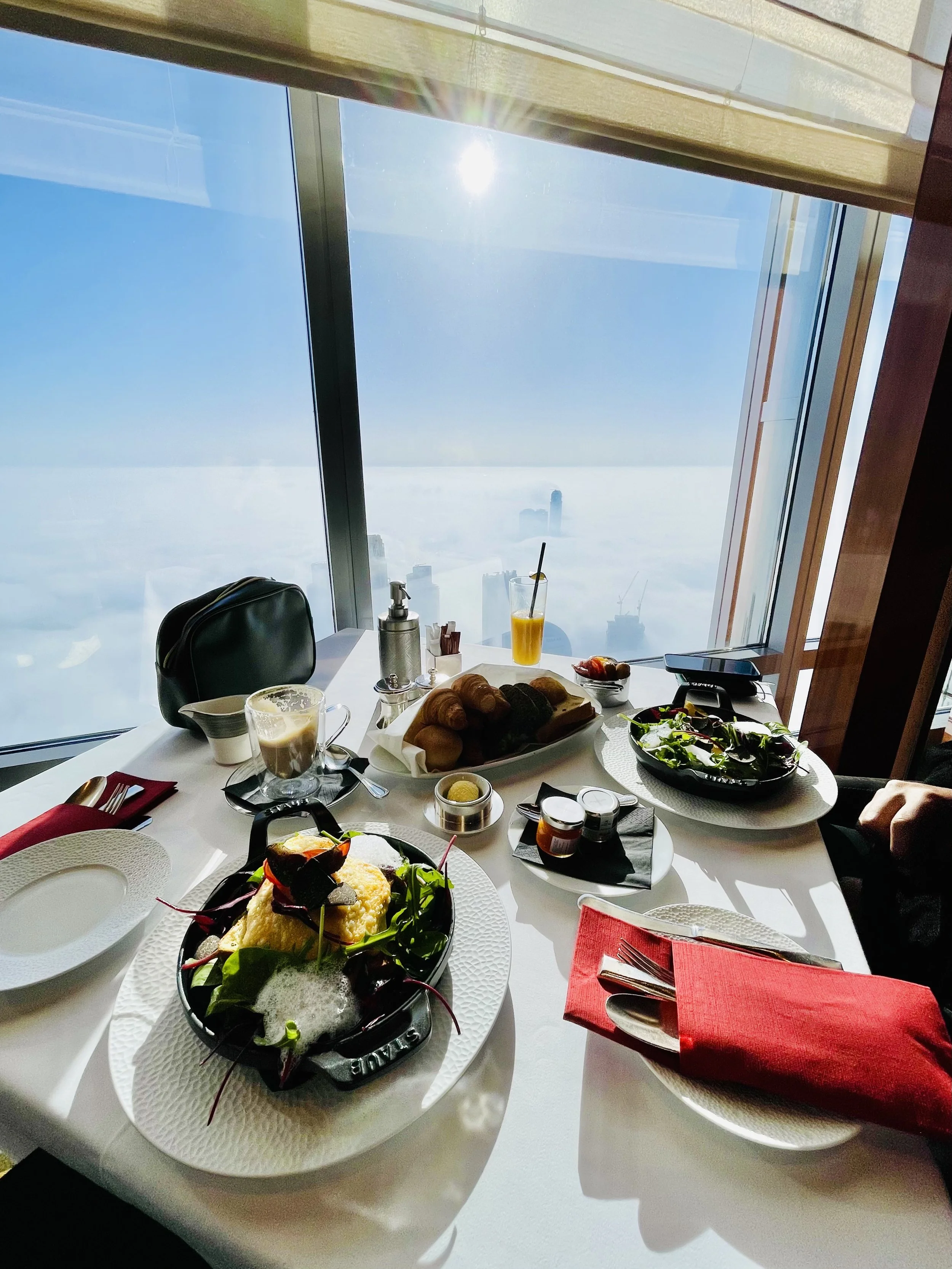 At.mosphere Restaurant sits on Level 122 of the Burj Khalifa and offers a fine dining experience with sweeping views of Dubai’s skyline. The restaurant is open daily, serving breakfast, lunch, high tea, and dinner. Minimum spend starts from AED 200 for breakfast and AED 600 for window seating during dinner. The menu features gourmet international cuisine, and reservations are recommended, especially for sunset slots.