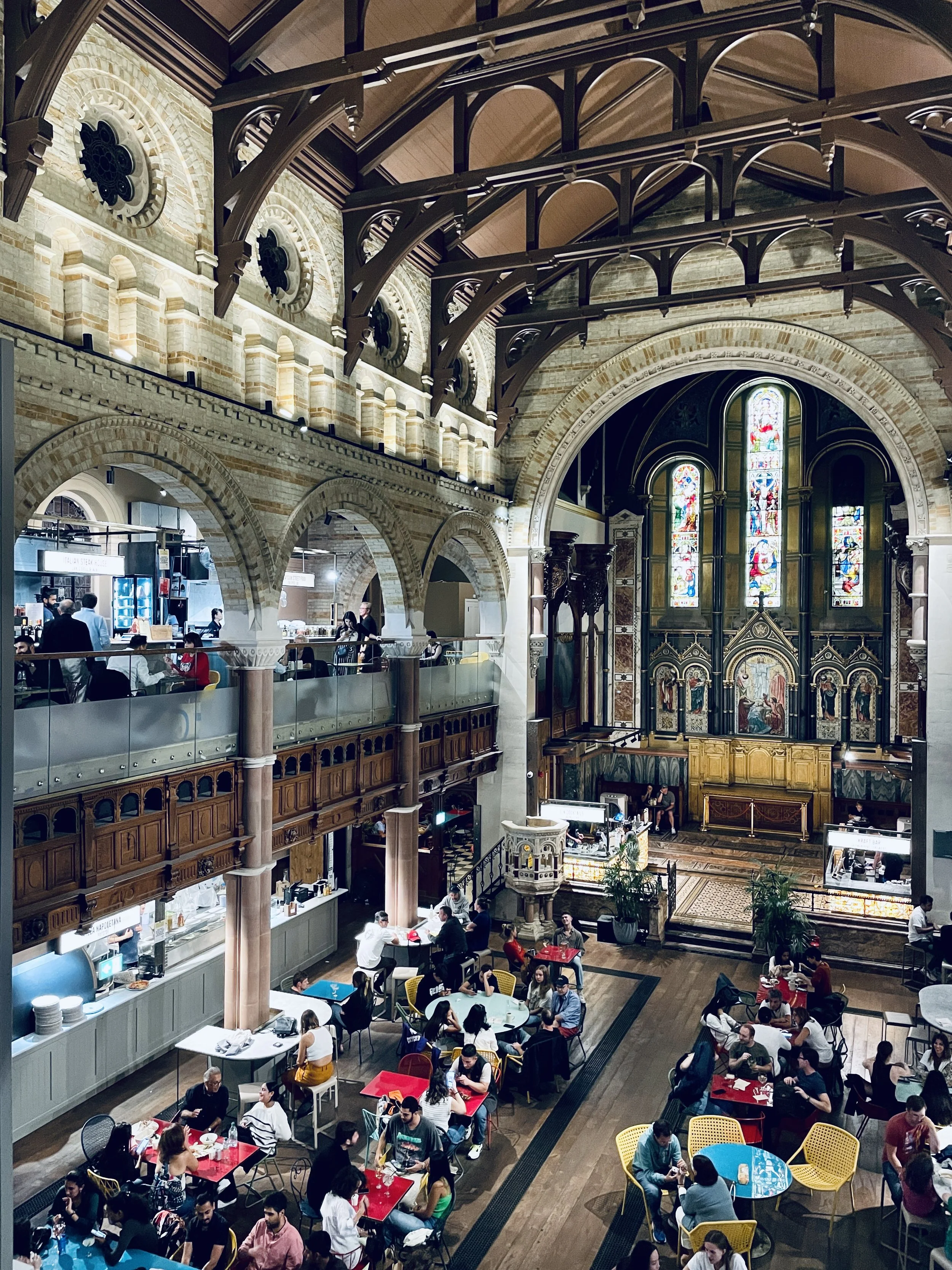 Set inside a deconsecrated church, this food market is a feast for the senses. There’s Italian pizza, Japanese bao, natural wine, and more—all served under stained glass and vaulted ceilings. A must for food lovers. With multiple levels, open seating, and a rooftop terrace, Mercato is as much a visual experience as it is a culinary one. It’s walk-in friendly and casual despite the grand setting—perfect for a spontaneous lunch or evening of grazing.